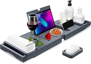 Eletecpro バスタブトレー バステーブル 竹製 伸縮式 バスタブラック バックスタンド 収納ラック お風呂用品 便利 多機能 (グレー)