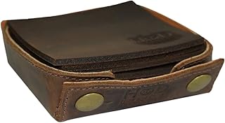 Hide & Drink、丈夫な厚手レザースクエアボックスセットコースター (6枚パック) ハンドメイド、ブルボンブラウン