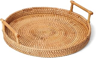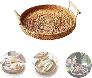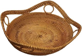 [AOLIPT]トレイ ラタントレイ フルーツバスケット パンかご 収納かご 藤編み 編み物 バスケット ハンドル付 円形 キッチン収納 浅型収納かご 朝食 手作り 果物トレイ 食器棚用 卓上 お菓子入れ 小物入れ 雑貨収納