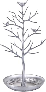 FUKUSHOP ジュエリー収納 ジュエリースタンド アクセサリースタンド アクセサリーディスプレイ ジュエリーホルダー ネックレス ピアス イヤリング ホルダー 収納ラック 飾り物 小物 指輪 腕時計 アクセサリートレイ 収納小皿 可愛い 小鳥 ツリー型 (シルバー)