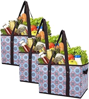 再利用可能な食料品バッグセット ショッピングボックス 強化底 高耐久 プレミアム 折りたたみ式 長い持ち手 ストレージボックス エコフレンドリー ビン キューブ スプリング (3個セット)
