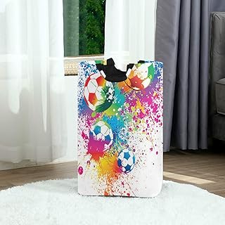 カラフルフットボールサッカー 大型ランドリーバスケット 洗濯かごバッグ グリーン レッド イエロー ブルー パープル 汚れた衣類収納箱 おもちゃ本 衣類ホルダー ハンドル付き ホーム バスルーム ベッドルーム 50L