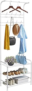 AKOZLIN 玄関収納ラック ハンガーラック ドアハンガー コート掛け 収納ラック コートハンガー 8フック付き 3段棚付き 衣服収納 洋服掛け バッグ掛け 帽子掛け 靴収納 寝室 リビング ルーム 組み立て簡単 ホワイト 幅65×奥行30×高さ180cm