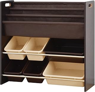RiZKiZ 絵本棚付おかたづけ収納ラック 【ダークブラウン×ベージュ&ブラウンボックス】 幅86.5cm 布製絵本棚 おもちゃ箱 おもちゃ収納 トイラック トイボックス マガジンラック